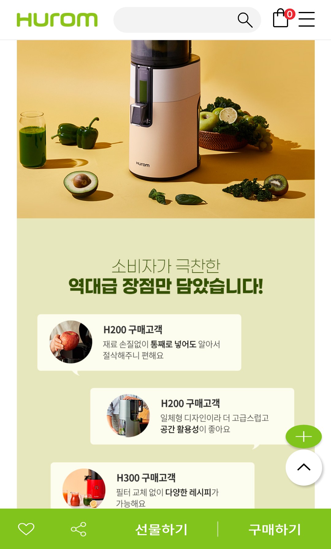 가정용으로는 H200 모델이 가장 인기 있어요. 한 번에 대용량 착즙이 가능해요.